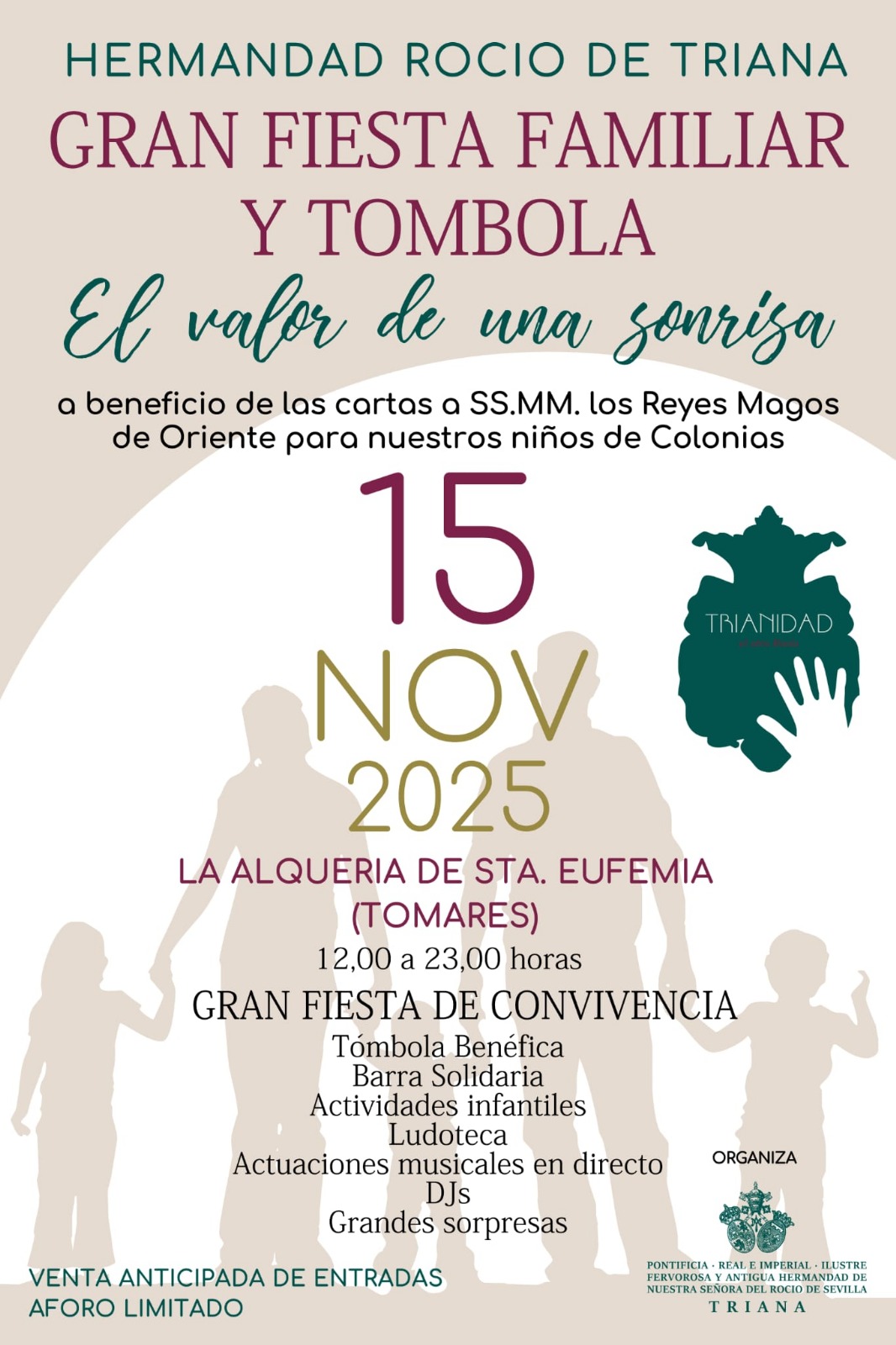 Venta anticipada de entradas, el día 1 de noviembre en la Casa Hermandad de El Rocío y a partir del martes día 3 en la Secretaría de la Hermandad en su horario habitual.