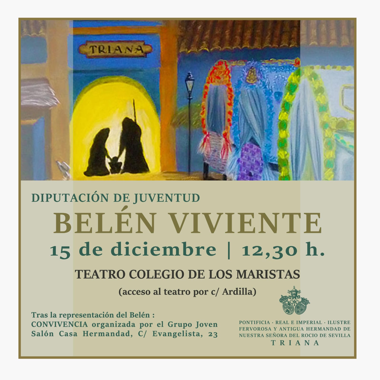 El próximo domingo día 15 de diciembre a las 12:30h, en el teatro del colegio San Fernando de los Maristas (acceso por la calle Ardilla), la Diputación de Juventud organizará la representación de un BELÉN VIVIENTE por los niños de nuestra Hermandad.