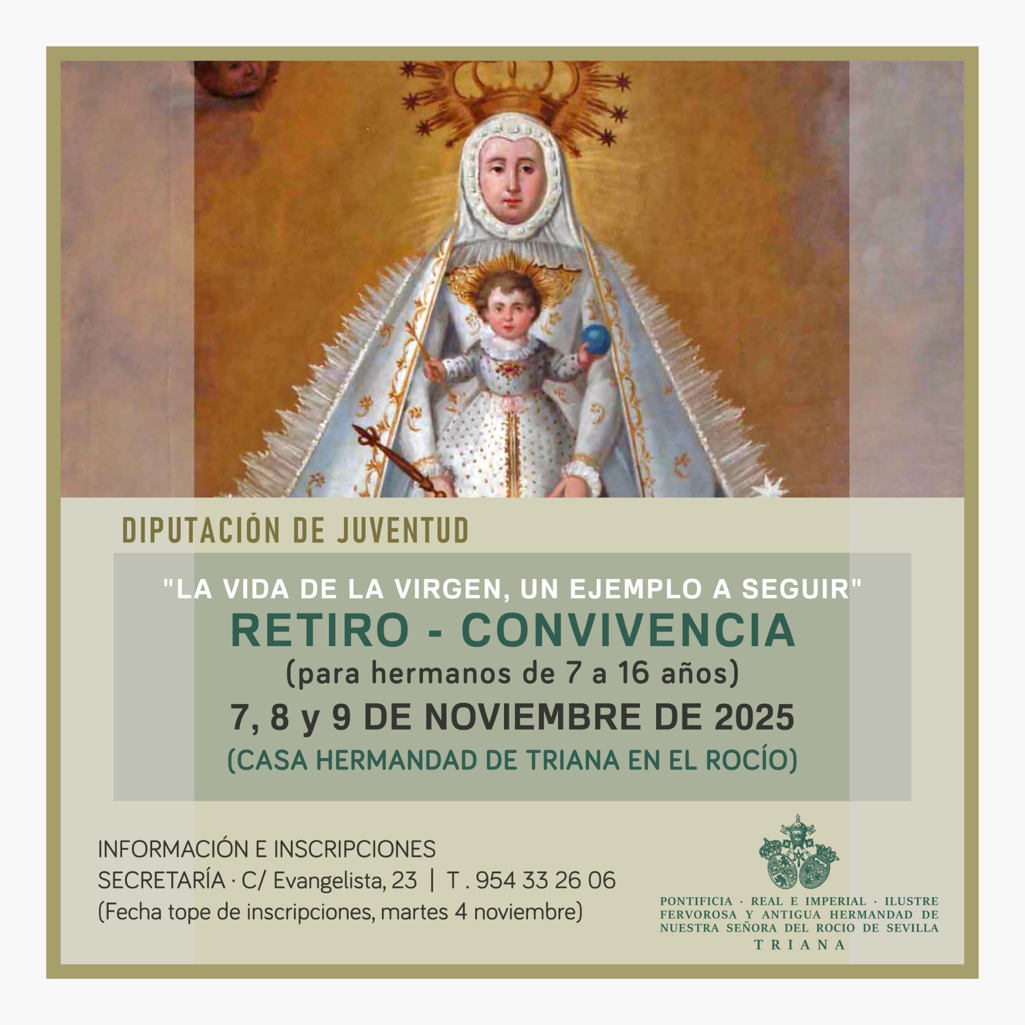 Durante los próximos días 7, 8 y 9 de Noviembre, la Hermandad, organizada por las Diputaciones de Juventud y Formación, celebrará en nuestra Casa de Hermandad de la aldea de El Rocío, una convivencia de Hermanos cuyas edades estén comprendidas entre los 7 y los 16 años.