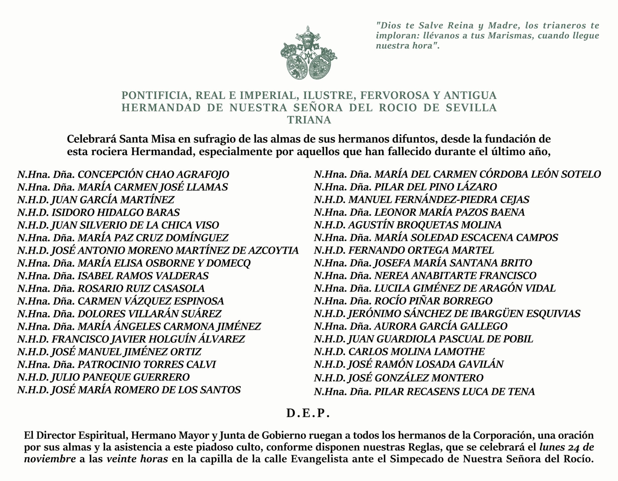 El Director Espiritual, Hermano Mayor y la Junta de Gobierno, ruegan a todos los hermanos de la Corporación una oración por sus almas y la asistencia a este piadoso culto, conforme disponen nuestras Reglas.